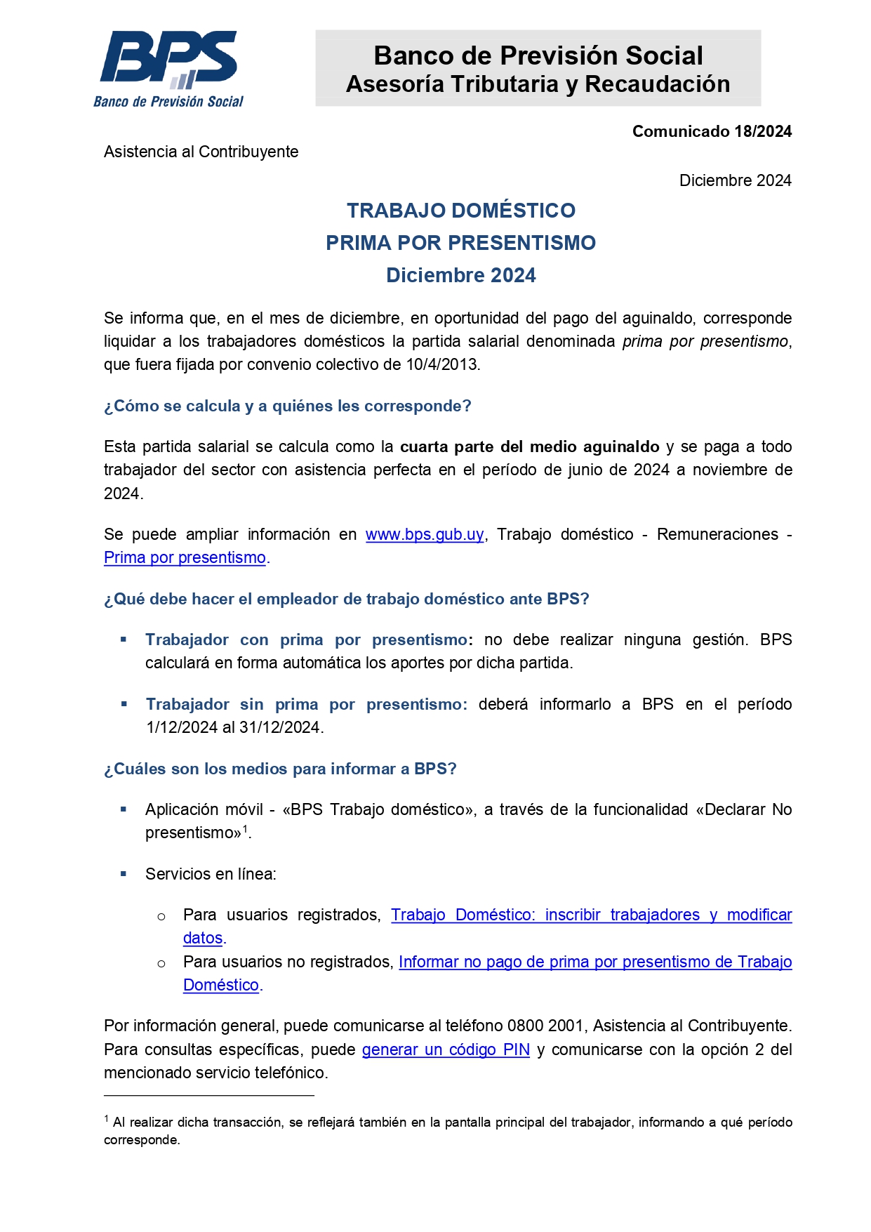 Se encuentra publicado el comunicado n.º 18/2024 con los principales aspectos a tener en cuenta referente a la prima por presentismo, creada por convenio colectivo del sector doméstico. Esta partida debe ser liquidada en las mismas oportunidades que el aguinaldo.