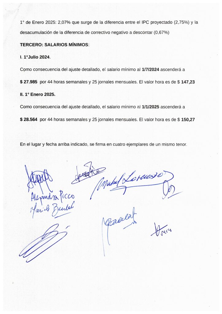Hoy jueves 25 de julio de 2024, tras una intensa reunión en el Ministerio de Trabajo, atendiendo a la solicitud realizada por la parte trabajadora ante el correctivo en negativo del presente ajusto y en aras de mantener el buen entendimiento y relacionamiento que ha caracterizado al sector, se acuerda en forma excepcional, modificar la forma de aplicación del correctivo anual, el que será aplicado en dos períodos: Julio 2024 y Enero 2025