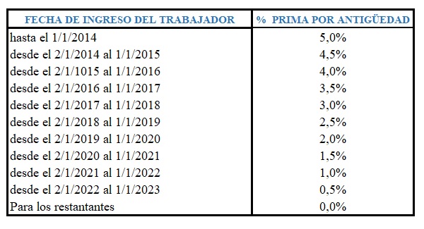 Tabla correspondiente al porcentaje de prima por antigüedad de acuerdo a la fecha de ingreso