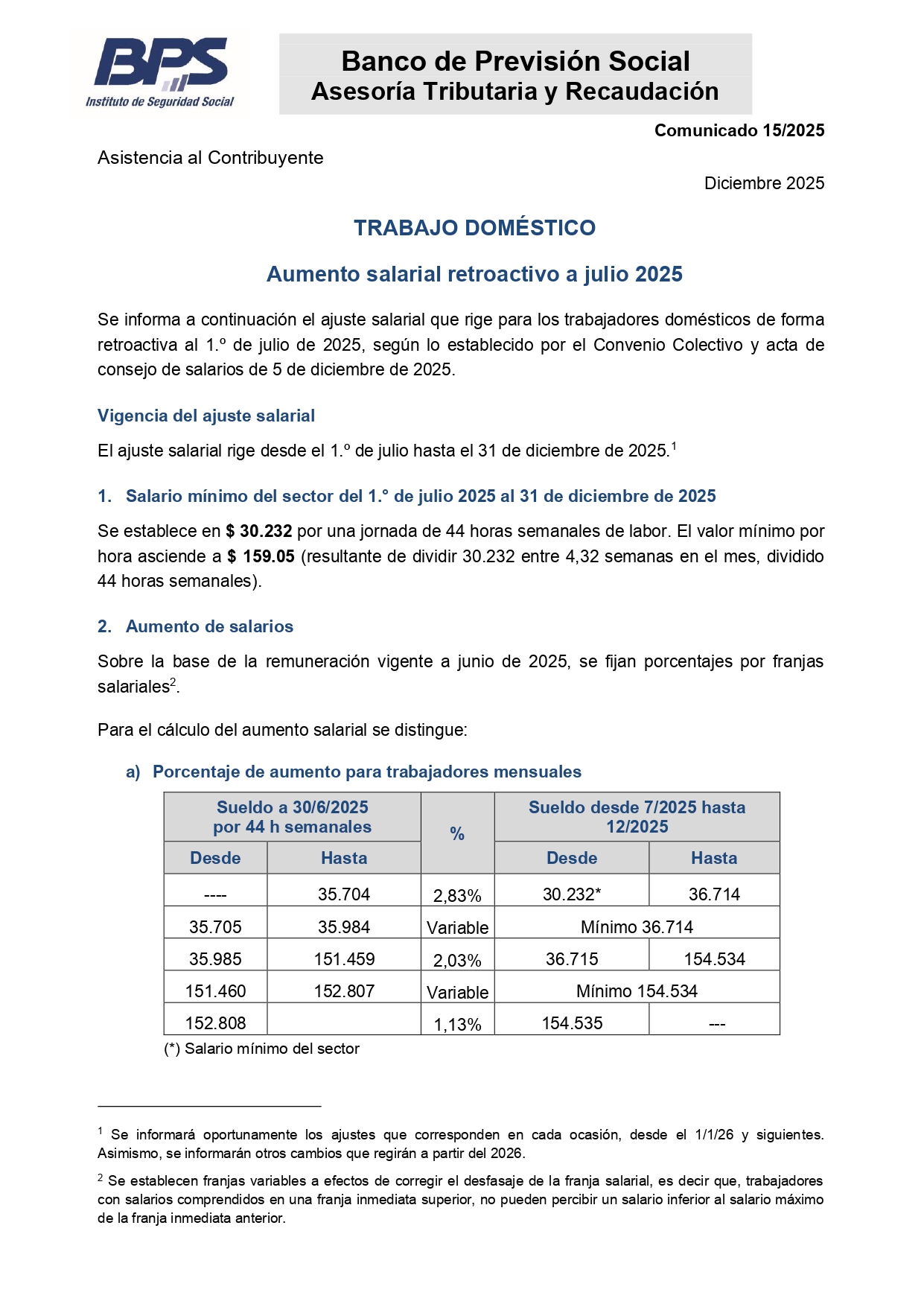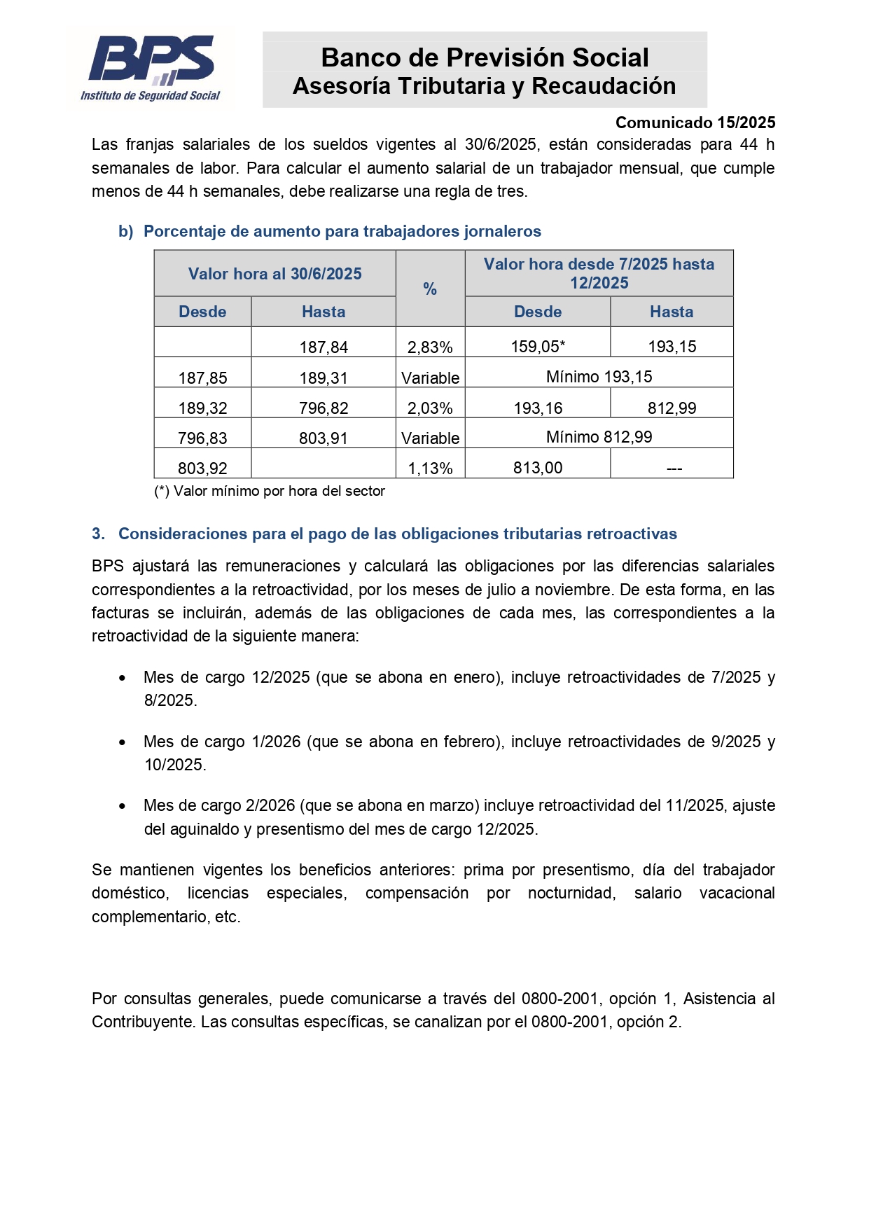 Comunicado de BPS de aumento de salarios para julio – diciembre 2025