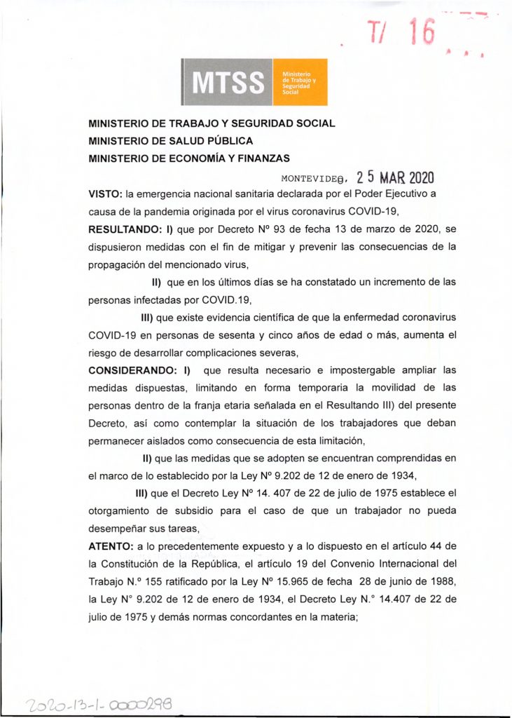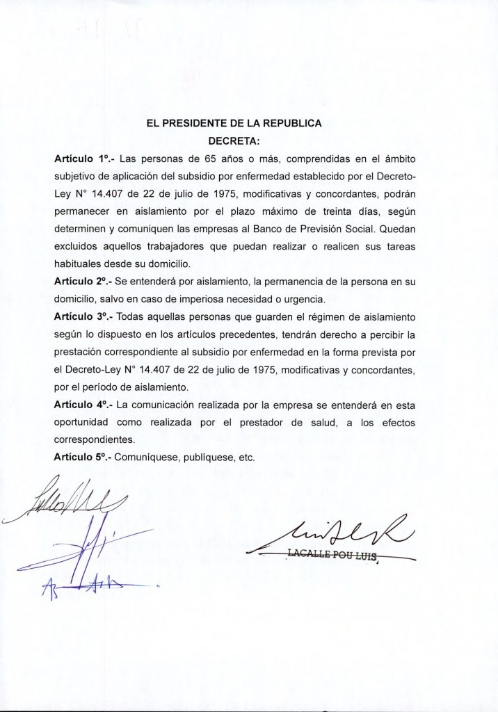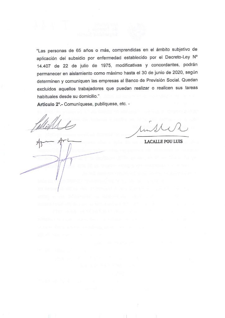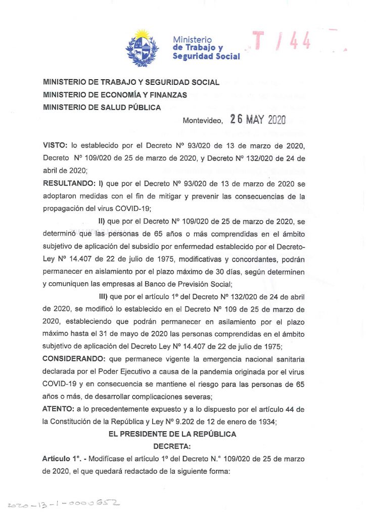 A solicitud de la Directora Representante Empresarial Bps Cra. Elvira Domínguez, informamos para su conocimiento, el Decreto de fecha 26 de mayo del presente, por el cual se modifica el art. 1 del Decreto Nº 109/020 de fecha 25.03.2020, extendiendo hasta el 30.06.2020 el plazo máximo que las personas mayores de 65 años – comprendidas en el Decreto- Ley N° 14.407 – pueden permanecer en aislamiento con derecho a percibir la prestación del Subsidio por Enfermedad.
