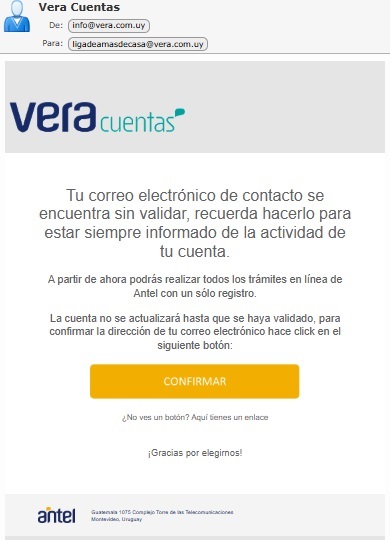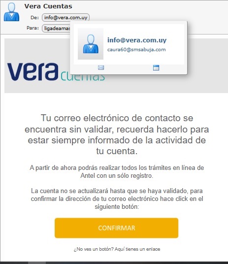 Como ustedes verán en la imagen parece un mensaje de ANTEL que me dice que el correo de contacto se encuentra sin validad, etc, etc, y que debo confirmar pulsando un boton amarillo. A pesar de tener @vera.com.uy una campana de alarma sonó en mi cabeza, ¿qué sucede si me paro sobre la dirección de mail de @? y entonces apareció estó…