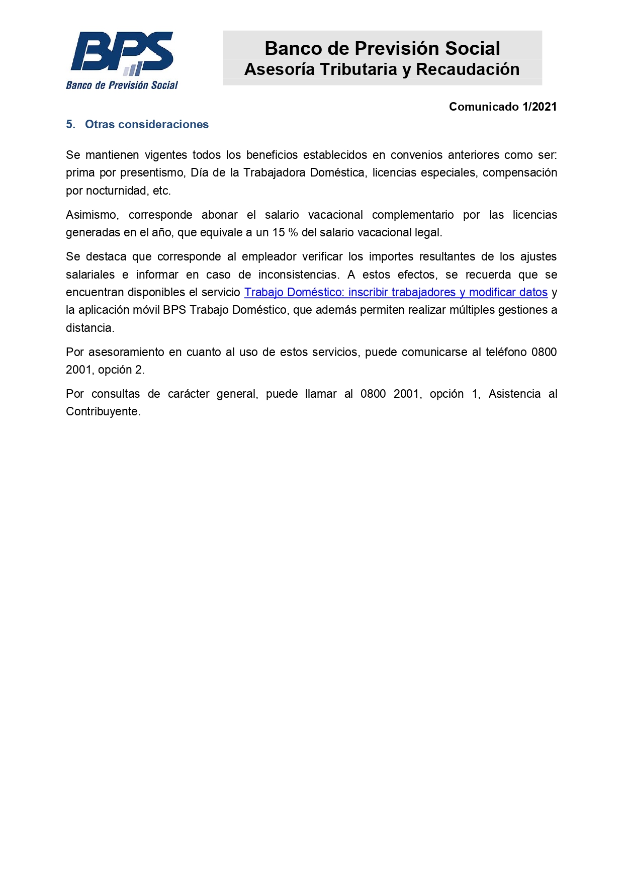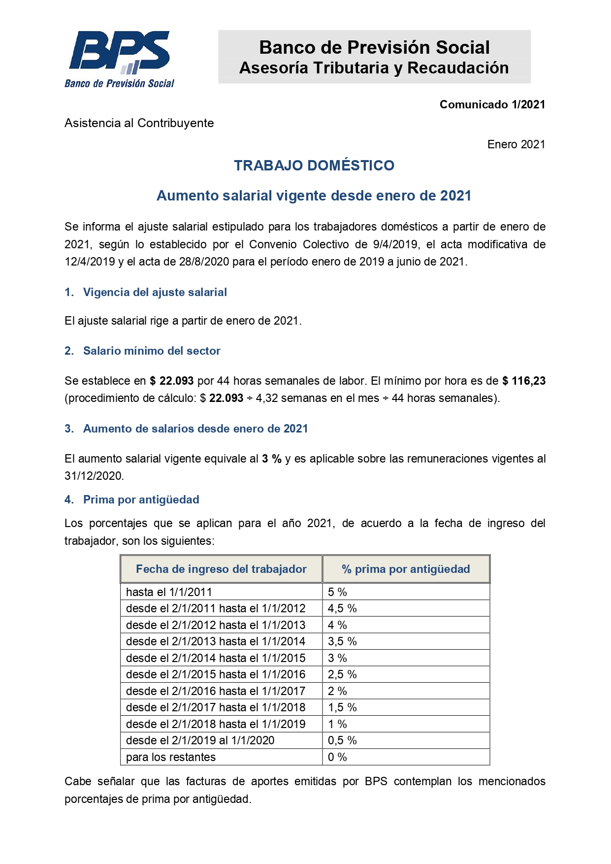 Se transcribe comunicado 1/2021 de BPS: Aumento Grupo 21 y Prima por antigüedad