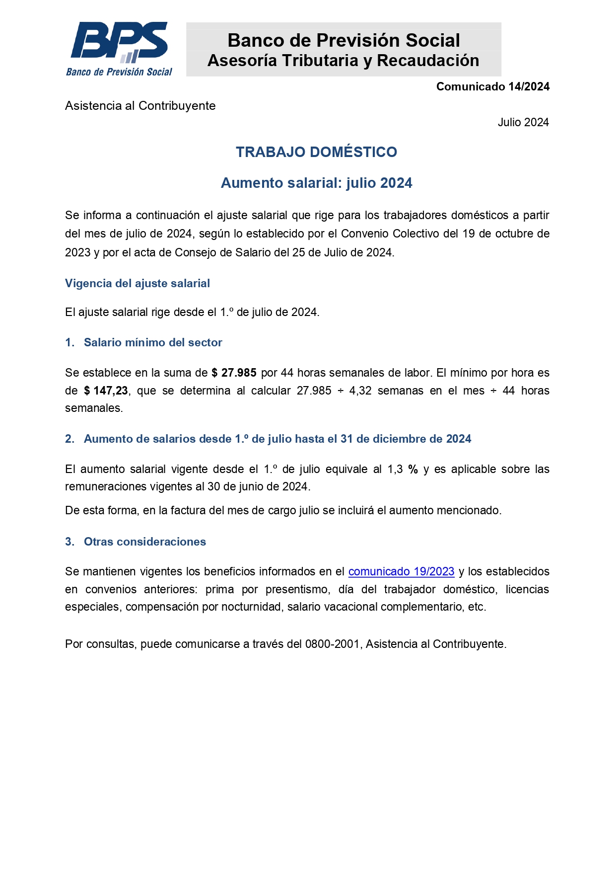 TRABAJO DOMÉSTICO Aumento salarial: julio 2024